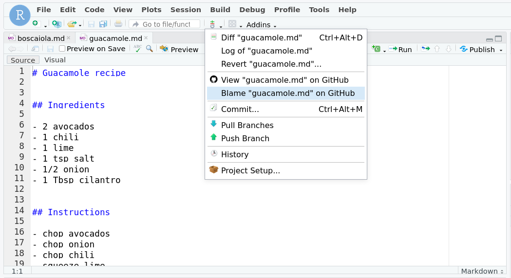 In the Guacamole recipe, find out who modified each line last and when (click on file, then click “Blame” button). Find out who added the cilantro and in which commit. (Hint: “Blame” view in the file view)