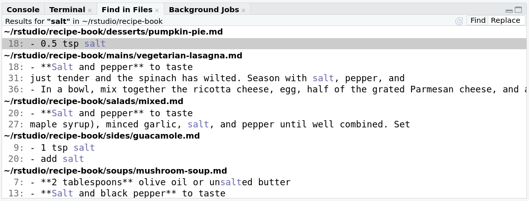 We go to the main recipe book view. We click the Search magnifying class at the very top, type “salt”, and click enter. We see every instance, including the context.